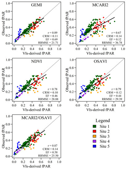 Correlations and statistics between observed and VIs-derived fPAR data obtained for the validation dataset.