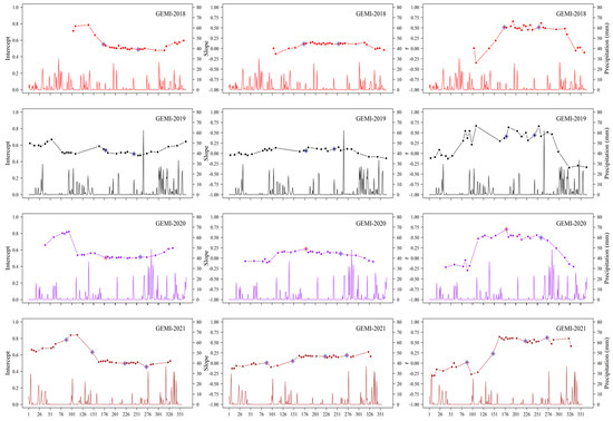 Intercept, Slope and Pearson’s correlation coefficient trends derived by the correlation between GEMI and olive tree pixel volume over the period 2018–2021 in Site 1. The seasonal trend of precipitation (mm) for the same period is displayed on the secondary y-axis. The data collection dates used for calibration and validation procedure are evidenced by red and blue diamond symbols, respectively.