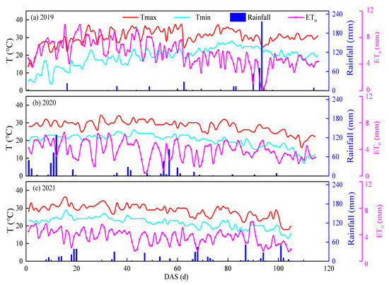 Meteorological data from maize sowing to maturity in 2019–2021 mainly included solar radiation, maximum temperature, minimum temperature, wind speed, relative humidity, and rainfall. The rainfall and reference crop evapotranspiration (ETo) during the maize growth period in 2019–2021 are shown in Figure 1, and the average rainfall values for each year were 440 mm, 528 mm, and 383 mm, respectively. After sowing, 0, 10, 20, 40, 60, 80, 100, and 120 became 00, 10, 15, 34, 53, 63, 79, and 89 growth stages of maize (BBCH scale), respectively.