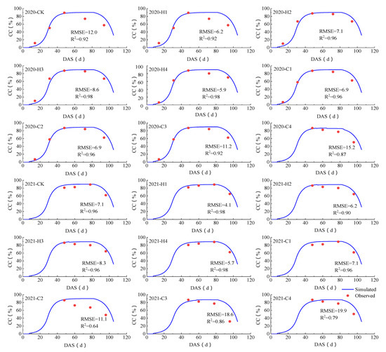 Simulated and observed canopy coverage curves of maize under all treatments in 2020–2021. CC is the canopy coverage of maize, and DAS is the days after sowing.