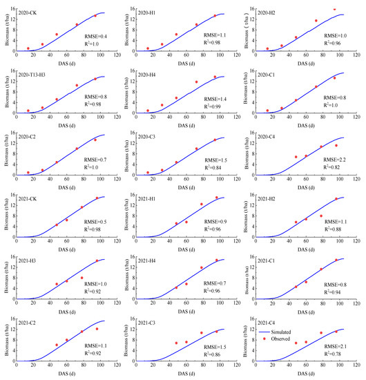 Simulations of aboveground biomass during the validation period were analyzed. As shown in Figure 3, the model could accurately simulate growth trends in the aboveground biomass of each treatment, although most of the simulated values were slightly lower than the observed values. Comparing irrigation treatments showed that the simulation results for the final aboveground biomass under HA treatments were better than those under CMC treatments.