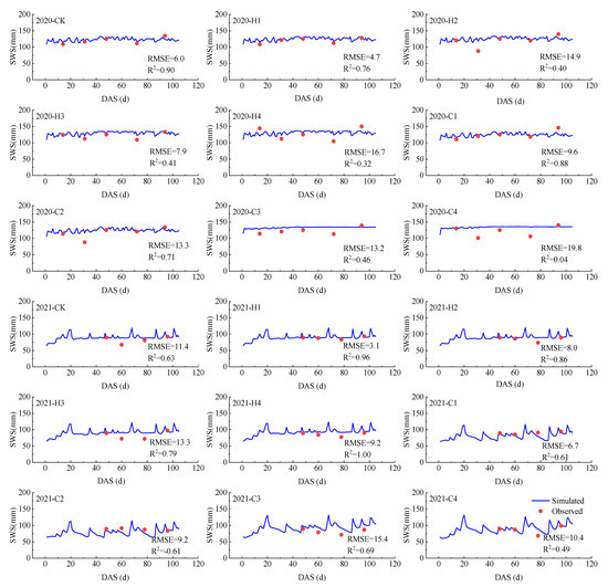 Simulation and observation of soil water storage under all treatments during 2020–2021. SWS is the soil water storage and DAS is the days after sowing.