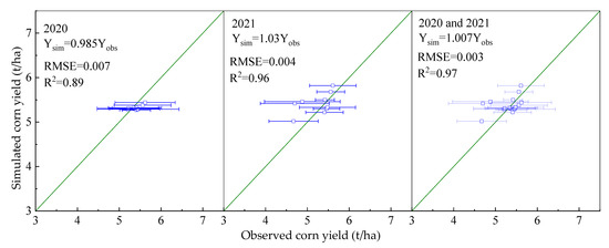 Observed and simulated maize yields for 2020 and 2021 seasons. The error bars represent standard deviations.