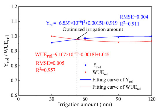 According to the needs of high yield and water-use efficiency, the optimized amount of irrigation could be determined. Through the maximum simulated yield and WUE, the simulated yield and water-use efficiency under each soil conditioner treatment scenario were normalized to find the optimized amount of irrigation. The relationship between Yrel and WUErel could also be described by the quadratic function of the amount of irrigation. Therefore, a reasonable amount of irrigation could be determined according to the response function of relative yield and relative water-use efficiency to the amount of irrigation. For example, when the initial salinity was 10 dS/m, the optimized amount of irrigation without soil conditioner treatment was 52 mm, as shown in Figure 6. The simulation results of other scenarios under each soil conditioner treatment could be obtained from the two response functions of relative yield and relative water use efficiency (Table 6). The results showed that the optimized amount of irrigation of maize for HA and CMC treatments were 47.0–65.9 mm and 61.0–92.4 mm, respectively, in the coastal saline–alkali area.