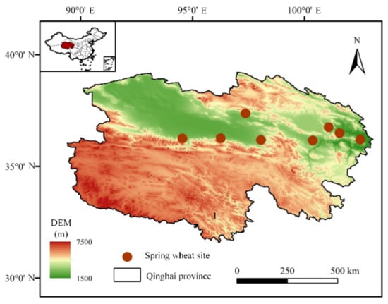 Qinghai province is located in the northwestern region of China, with an area of approximately 720,000 km2, accounting for 7.5% of the total Chinese area. Qinghai is an arid and semi-arid area with an annual average temperature of 2–9 °C, a frost-free period of 100–200 days, and annual average precipitation of 25–500 mm [56]. There is large variability in precipitation, with higher precipitation in the southeast and lower precipitation in the northwest. Spring wheat is one of the main food crops in Qinghai Province.