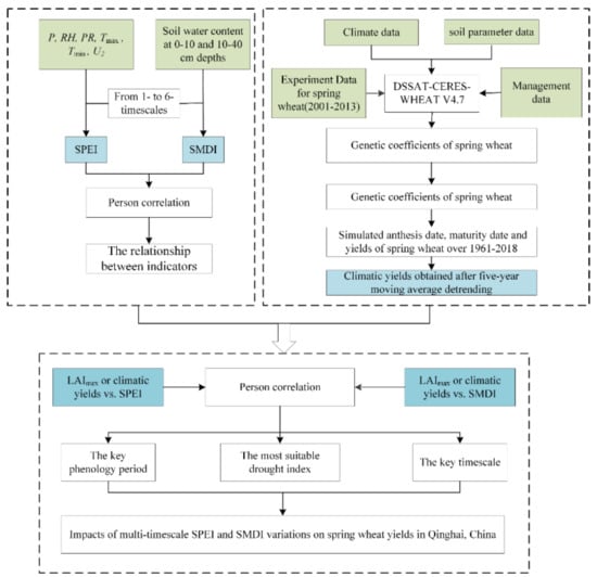 Previous studies combined different drought indices with crop growth or yield-related indices to study the impact of drought on crop yields, but only a single meteorological or agricultural drought index was applied. Few studies have compared different drought indices and their appropriateness for monitoring drought conditions and drought impacts on agriculture and crops. The objectives of this study were (1) to compare the differences and connections between the meteorological drought index (SPEI) and the agricultural drought index (SMDI) at 0–10 cm and 10–40 cm depths in monitoring the drought at each growth stage of spring wheat in Qinghai province, China; (2) to identify the more appropriate drought index, the key month on spring wheat growth, and the key timescale of the selected better drought index that denote a closer relationship between spring wheat growth yields and drought severity based on correlations between the spring wheat growth and drought indices; and (3) to analyze the relationship between yield reduction rate calculations based on selected drought index and wet and dry conditions at the key month under the key timescale.