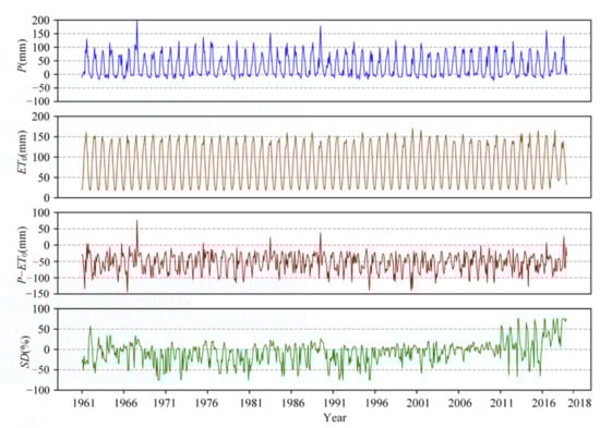 A total of eight sites were selected for this research. However, there was a great amount of data and the characteristics of the studied variables were similar; therefore, here the Gonghe site is taken as the example for it is representative of the selected 8 sites. The temporal variations of monthly P, ET0, P − ET0 and soil moisture deficit in 1961–2018 are compared in Figure 3. The results showed that P and ET0 have relatively similar patterns of variation within years, P (or ET0) increased from April or May and reached peaks in July or August. Monthly P − ET0 ranged between −75 mm to 50 mm and were largely negative, indicating Gonghe suffers long-term drought. Soil moisture deficit varied more randomly than P and ET0, but the values were generally higher from May to August than the other months. The other 7 sites showed similar annual patterns, but there were some regional differences in precipitation (Figure S1), with sites located in the west of Qinghai province (Deling, Geer, Nuomu, Geer) having less rainfall than the eastern sites (Huangyuan, Gonghe, Huzhu, Minhe).