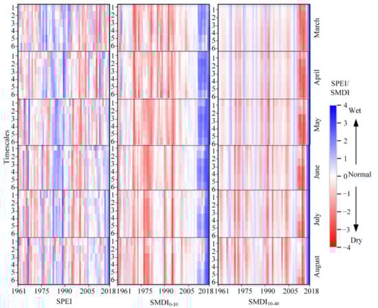 The results in Figure 4 showed that (1) SPEI varied more randomly than SMDI over 1961–2018, with a wetter period over 1980–1989. From SMDI0–10, there was a long drier period from 1970–1996 but a short wetter period from 2010–2018. Variations of SMDI10–40 were generally similar to SMDI0–10 but looked wetter over the entire studied period, with a typically different short drier period of 2011–2016, and (2) at the 1- to 6-month timescales, SMDI (0–10 and 10–40 cm) during the growth stage of spring wheat varied similarly, reflecting generally consistent dry or wet conditions. Variations in SPEI at different timescales were less similar than those in SMDI and (3) in different years and months, the drought levels identified by SPEI and SMDI (0–10 cm and 10–40 cm) were not consistent. For example, the year 2001 was identified as a severe drought by SPEI, but a normal year according to SMDI (both at 0–10 cm and 10–40 cm depth), while 1991 was identified as a normal year by SPEI but a moderate drought year by SMDI (0–10 cm and 10–40 cm).