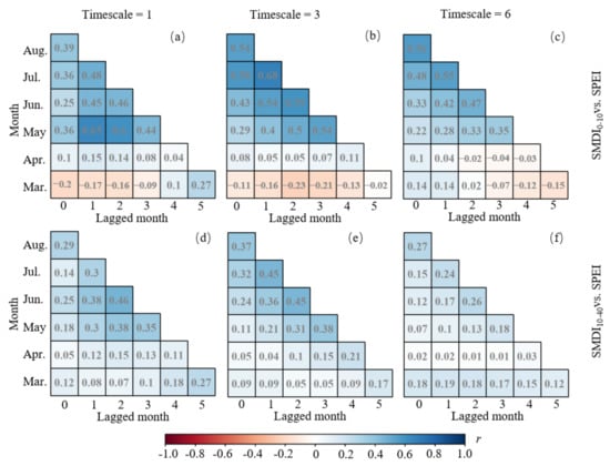 The r values between SPEI and SMDI0–10 (a–c) or SPEI and SMDI10–40 (d–f) at the 1, 3 and 6-month timescales with lagged time of 0 to 5 months during growth period of spring wheat (March to August).