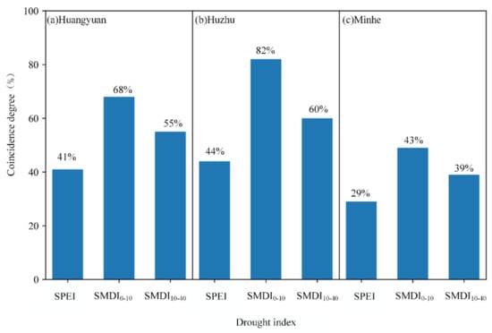 The coincidence between drought events indicated by SPEI and SMDI compared with the actual drought events is identified by Huangyuan, Huzhu and Minhe, where historical data are relatively complete (Figure 6). The results showed that SMDI0–10 among the three indices had the highest agreement with actual drought conditions (43–82%), followed by SMDI10–40 (39–60%) and SPEI (29–43%), respectively. This may be due to the fact that most of the actual drought records were related to rainfall deficits, damage to farmland, and reduced grain production.