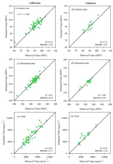 The performance of the DSSAT–CERES–wheat model has been evaluated by plotting the simulated and observed anthesis date, maturity date, and yield values of spring wheat for both calibration and validation processes (Figure 7), and the R2 and RRMSE were used to verify whether the simulated value is consistent with the observed value. The results showed that the higher R2 (0.70 < R2 < 0.85) and lower RRMSE (0.04 < RRMSE < 0.18) between simulated and observed values during the calibration and verification process indicated a better accuracy of the model simulation. Therefore, the calibrated genetic parameters of spring wheat could be further used for the simulation of crop growth and yield over the period 1961–2018 at the eight studied sites.