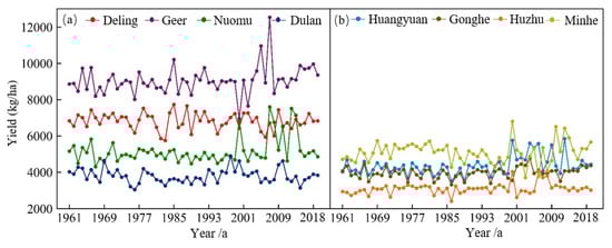 The annual variations of simulated (climatic) yields over 1961–2018 for the 8 selected sites. ((a) The 4 sites in the figure are located in the Qaidam Basin, and (b) the 4 sites in the figure are located in eastern Qinghai Province).