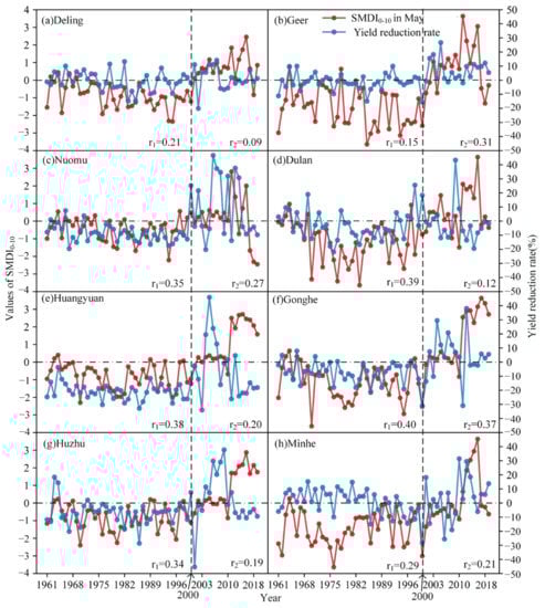 Annual Variations of yield reduction rate vs. 2-month-timescale SMDI0–10 in May at the selected 8 sites over 1961–2018. r1 and r2 mean the Pearson correlation coefficients between production reduction rate and SMDI0–10 in May in 1961–2000 and 1961–2018.