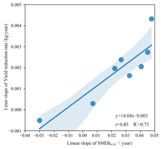 The relationships between linear slopes of 2-month SMDI0–10 in May and the yield reduction rate at the eight selected sites are illustrated in Figure 10. The linear slopes of 2-month SMDI0–10 in May and yield reduction rate ranged from −0.04/a to 0.05/a and from −0.001 kg/a to 0.005 kg/a, respectively. Additionally, the linear slopes of 2-month SMDI0–10 in May in seven out of eight sites were positive, indicating that the climate conditions have a tendency to become wet from 1961 to 2018. Moreover, there was a considerable linear relationship between them with r = 0.85, suggesting that the trend of SMDI0–10 in May was greatly consistent with the trend of spring wheat yield reduction rate from 1961–2018.