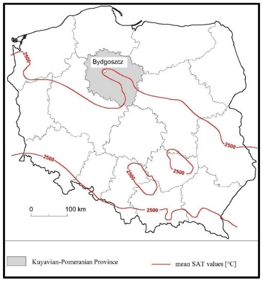Most of the region of Bydgoszcz is suitable for vine planting and viticulture, as a large part of the region is located within the isoline of the sum of active temperatures (SATs) of 2500 °C, which define areas suitable for viticulture (Figure 2). In the case of grapevines, SATs are calculated as the sum of the average daily temperature above 10 °C, which is the basic climatic criterion for delimiting areas suitable for growing this species [49,50]. In the years 1981–2000, in central Poland, the average value of SAT reached almost 2500 °C; in 2003, the SAT exceeded 2700 °C, and in 2006, the SAT was as much as 2900 °C [21]. On the other hand, in north-eastern Poland, the SAT value was around 2200 °C, in the highlands of the central part of the country the SAT was 2600 °C, and in the south-west and west Poland, the SAT was 2700 °C [3,51].