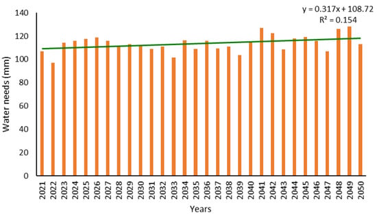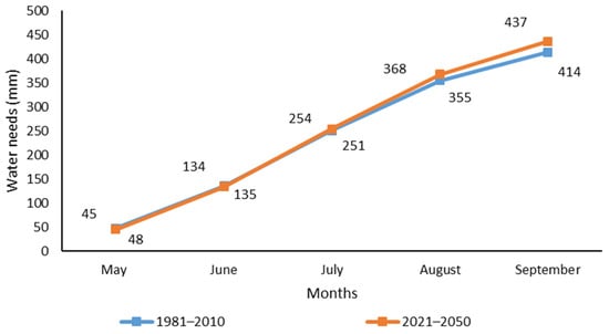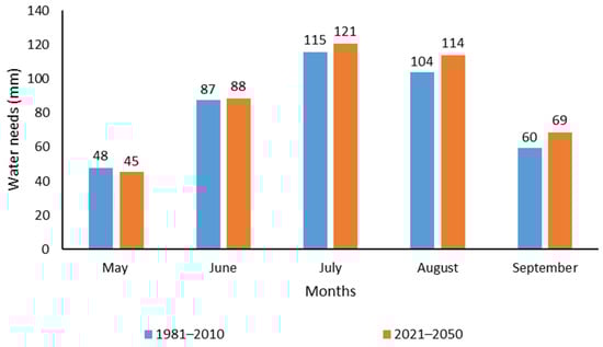 In the light of the anticipated climate changes, the total water needs of grapevines during the growing season in the region of Bydgoszcz will increase from 414 mm (average for the years 1981–2010) to 437 mm (average for the years 2021–2050) (Table 4 and Figure 6). For comparison, the average water needs of grapevines in western Poland in the years 1981–2010 was 438 mm [29]. In the present study, ultimately, the predicted increase in the water needs of grapevines will be 23 mm, i.e., 6%. Therefore, it is predicted that during the irrigation period, in the forecasted years, the grapevine water needs will increase from 306 mm to 323 mm, i.e., by 17 mm and by 6%. Among the considered months of the growing season, the greatest increase in grapevines’ water needs by 10 mm, i.e., by 10%, will take place in August.