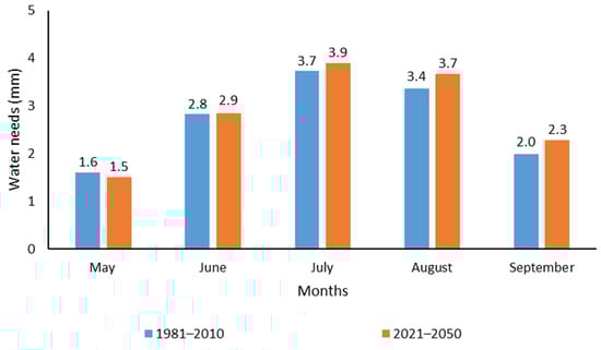 Figure 4 and Figure 5 show the grapevines’ daily and monthly water needs during the growing season in the reference and forecast years, respectively. The highest water needs of grapevines, both in the reference years and in the forecast years, were calculated in July. Slightly lower values of water needs were recorded in August, and even lower in June. The lowest water needs of grapevines were calculated in May and September. With the exception of May, both the daily and monthly water needs of grapevines in the forecast years were higher than in the reference years. In western (1981–2010) and central (1981–2020) Poland, the highest daily and monthly water needs of grapevines were also recorded in July [28,29].
