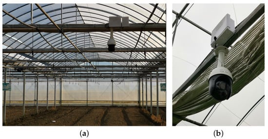 In order to train the deep convolutional neural network and test the algorithm proposed in this paper, images of leafy greens ( (L.)) are obtained from greenhouses in Shanghai. To take images of leafy greens in the same area for multiple days, several fixed cameras are mounted on the top shelf of the greenhouse. The installation of the camera in the greenhouse is shown in Figure 1.