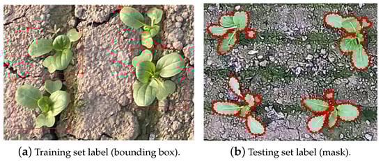 In order to train the data-driven model for green leaf vegetable segmentation, more images were further collected using fixed cameras and smartphones to construct the training dataset. The leafy greens in these images are only labeled as bounding boxes because the labeling of pixel mask is too laborious. The annotation format is shown in Figure 2a. The effort to label bounding boxes is tens of times less than that for masks. However, due to incomplete labeling information, previous segmentation algorithms [,,] cannot be trained directly. In this paper, weakly supervised learning based on boundary boxes is employed to train the instance segmentation model of leafy green vegetables.