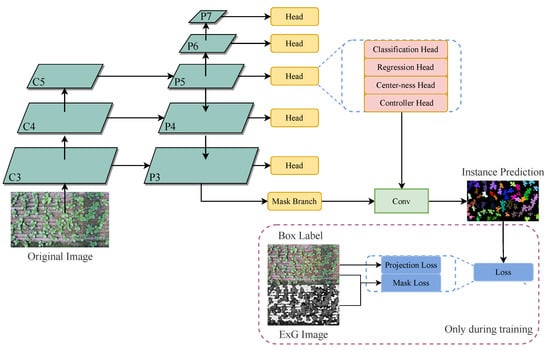 This paper constructs neural network based on ResNet50 (Residual Network) [] to achieve the balance between fitting ability and data scale. After the backbone network, different depth features are fused through FPN structure [], and the mask prediction network proposed by CondInst is connected behind each feature layer. Complete model inference and mask loss calculation process are shown in Figure 3. Other parts not mentioned, such as classification and regression loss, are the same as CondInst [].