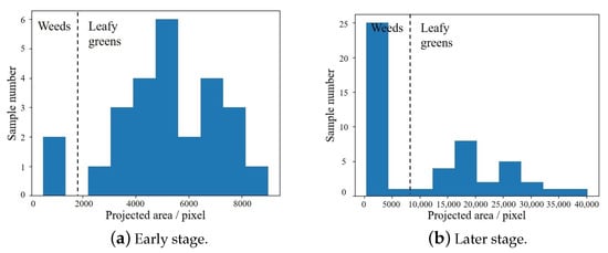 Fortunately, the top-view projected area of weeds is often significantly smaller than that of leafy green vegetables. Therefore, the area distribution of all instances in the image can be analyzed by top-view projected area histogram. As can be seen from Figure 4, there is a deviation between the area distribution of weeds and leafy green vegetables, so it is feasible to filter weeds through analyzing the top-view projected area.