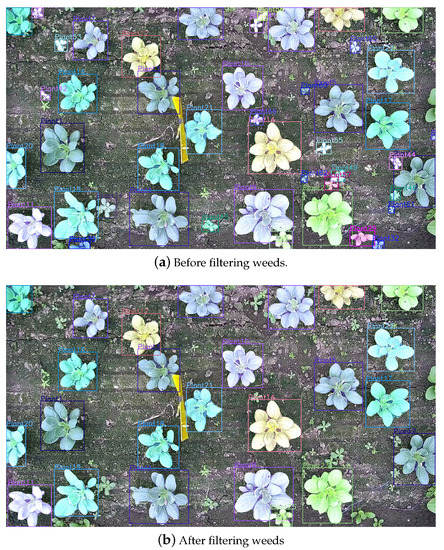 Comparison of weeds before and after filtering. As shown in Sub-figure (a), some objects are misidentified as leafy greens. After filtering weeds, objects that are mistakenly identified as leafy greens are removed, as shown in Sub-figure (b).