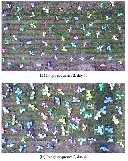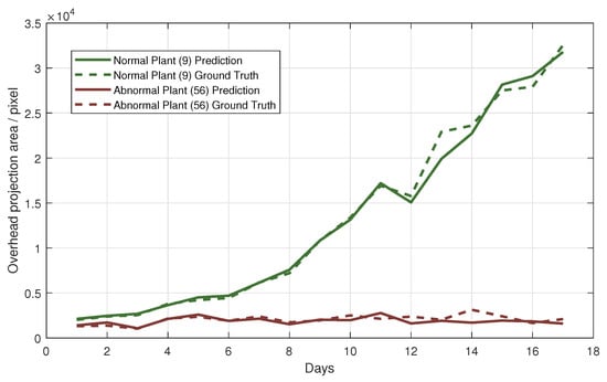 According to Equations (21) and (22), abnormal growth vegetables in the image are identified, and the visualization results are shown in Figure 10. This section identifies abnormal growth plants based on 2-day phenotypic changes, which means in the Equation (21). In the 321 tracking sequences of leafy green vegetables in the test set, 11 tracking sequences are abnormal, showing the trend of wilting and death, and the other 310 sequences show normal growth status. According to Equations (21) and (22), 10 abnormal growth sequences are correctly identified, 1 abnormal growth sequence is misclassified as normal, 5 normal sequences are misclassified as abnormal, and the remaining 305 normal sequences are correctly classified. As can be seen from the visualization results in Figure 10 and the quantitative experiment results, after the segmentation and tracking of leafy green vegetables, abnormal growth plants can be found and alerted by monitoring the top-view projected area, which has application potential in fine cultivation of plants.
