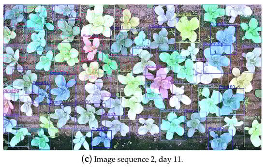 Visualized results of leafy greens instance tracking. Each leafy green has a unique ID that remains the same during tracking and is noted in the upper left corner of the bounding box. Sub-figure (a–c) are visualized results in 3 different days.