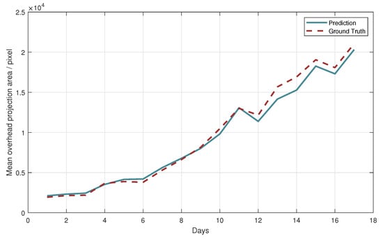 Taking an image sequence as an example, the curve of its mean top-view projected area changing with days is drawn in Figure 7. The predicted curve can reflect the trend of the top-view projection of leafy green vegetables as well as the real curve. On the 12th and 16th days, the intense light and lack of water caused the contraction of the leaves of most leafy green vegetables, and the model trained in this paper could capture this phenomenon and provide timely warning. The image of leafy green vegetables on the 12th day is shown in Figure 8.