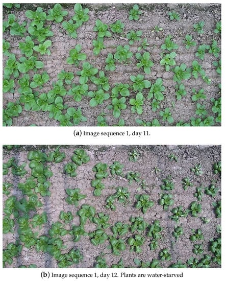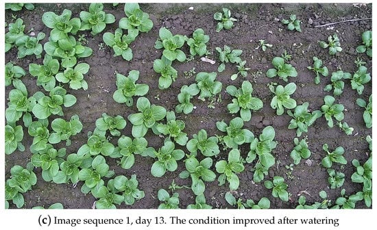 Images from day 11 to day 13 day in image sequence 1. As a result of the day light intensity caused water shortage, leafy green vegetables appear leaf shrinkage phenomenon, as shown in the change between Sub-figure (a,b). After watering, most of the plants returned to growth, as shown in Sub-figure (c).