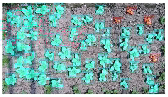 The instance segmentation model introduced in Section 3.1 is trained with the configuration in Section 4.1, and the model is evaluated on the testing set. The effectiveness of the proposed method is evaluated by Precision, Recall and F1-score. Weed filtering is not carried out in the calculation of the evaluation indexes, because weed identification is also an ability that instance segmentation models should have. The results of instance segmentation are shown in Table 2, which shows that weakly supervised learning based on color similarity of ExG feature achieves excellent results. While Recall is pretty high, the model trained through ExG similarity predicts less false detection, and its Precision is significantly higher than LAB model. Visualized segmentation results of leafy greens are shown in Figure 5. The shape and location of leafy greens are well predicted, but some weeds are detected incorrectly.