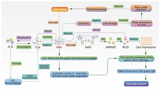 Diagram showing the mechanisms by which ABA improves heat resistance by inducing stomatal closure, promoting root growth and maintaining plant water status. ABA, abscisic acid; Cys, cysteine; H2S, hydrogen sulfide; NAD, nicotinamide adenine dinucleotide biosynthesis; NMNAT, nicotinate/nicotinamide mononucleotide adenyltransferase; NO, nitric oxide; PR, prevent; RG, regulate; ROS, reactive oxygen species.