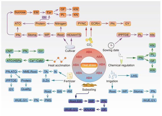Heat-tolerant cultivation and tillage techniques may be used for improving production in wheat and maize under heat stress. The physiological basis for these methods is the regulation of ABA to induce heat tolerance in crops. For example, heat-tolerant wheat and corn varieties with the following characteristics can be chosen: advanced heading time, large antioxidant capacity, high starch-synthesis-related enzyme activity, large amounts of storage-protein accumulation, and pollen and roots that are resistant to heat stress. Other methods include changing the sowing date to avoid high-temperature stress, spraying plant growth regulators on foliage before and after high-temperature stress to improve heat tolerance, and applying nitrogen, zinc, and sulfur fertilizers as topdressing before and after flowering to reduce the negative effect of high-temperature stress on productivity. In addition, inoculating roots with arbuscular mycorrhizal fungi can reduce the negative effect of high-temperature stress on yield. Increasing CO2 and higher temperatures are regulated by ABA and redox homeostasis networks to mitigate high-temperature stress. Using a suitable irrigation system can also lower the heat sensitivity of plants. Subsoiling soil prior to sowing can alleviate the negative effects of high-temperature stress on yield. These cultivation and farming systems have been applied in the field to improve crop production. However, there is still a lack of research on the integrated application of multiple technologies. In the future, we should focus on the integration of heat-resistant cultivation techniques and innovate heat-resistant agronomic management. In addition, the relationship between high-temperature stress and ABA needs further study; especially, quantification of the association between ABA, physiological activity and heat tolerance is challenging [107]. We can focus on quantifying ABA levels and the production and transport of photosynthates in plant organs, soil water and roots, ROS, antioxidant enzyme activities, HSPs, nitrogen-metabolism enzyme activities, chloroplast structure, photosynthesis and water status in leaf or non-leaf photosynthetic organs, pollination, storage-protein accumulation and grain-filling characteristics in the spike under high-temperature stress and determine how they relate to each other. An understanding of these factors and their interactions will allow the development of a system for cultivating plants under high-temperature stress. Furthermore, this study mainly summarized the mechanism of ABA regulation of heat tolerance from the physiological and biochemical levels, and the mechanism from the level of genomics and proteomics is still to be elaborated in the future.