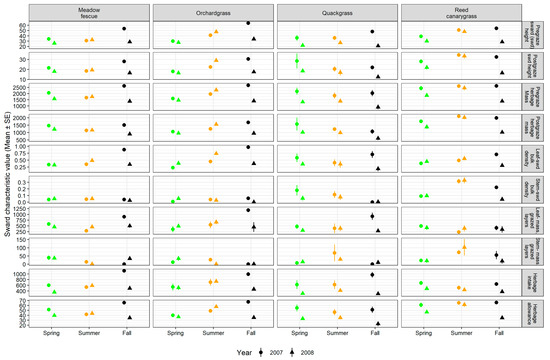 There were no significant (p > 0.10) grass–season–year interactions for the postgraze sward height, the postgraze herbage mass, or the herbage allowance (Table S1). There were no significant differences (p > 0.10) in the postgraze sward height among the grasses during the spring of 2007, nor during the spring of 2008 (Table S2). The sward height of RCG was greater than that of the other grasses during the summer (p = 0.005), with the exception of ORG, which was greater in the summer of 2008 (p = 0.012). The postgraze sward height of RCG exceeded the heights of the other grasses in the fall period of 2007 (p = 0.012) but not in the fall period of 2008 (p > 0.10). The sward height of QGR was frequently less than that of the other grasses across the year (Figure 1)