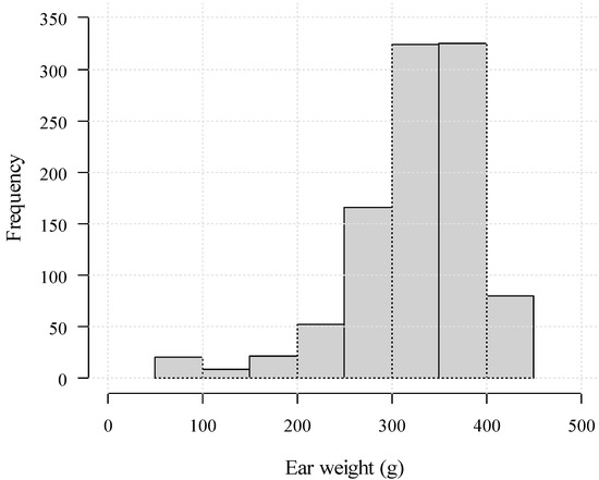 Figure 5 shows the distribution curve for the individual ear weight, with the minimum of 50 g, maximum of 450 g, and mean of 330 g representing a hybrid with high potential yield. Resulting from the left-skewed distribution, the yield in case of small sample size is over-estimated. The Shapiro–Wilk test showed that the ear weight is not normally distributed (p < 0.05). Hence, e.g., Pearson product-moment correlation coefficient is not applicable for the crop production modelling.
