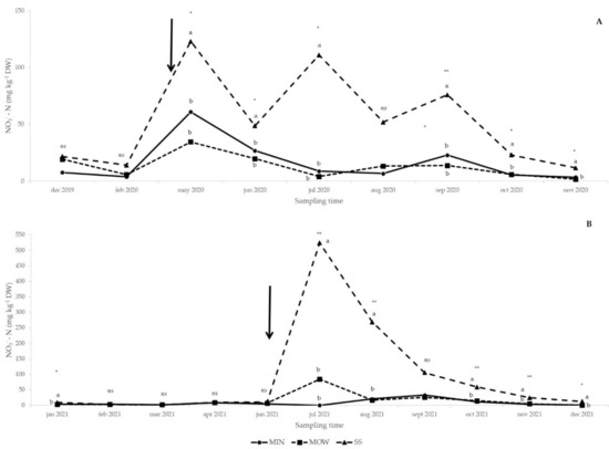Effect of fertilization treatments on soil nitrate-N (NO3−-N) concentration from December 2019 to December 2020 (A) and from January 2021 to December 2021 (B). Arrows: amendment applications (20 April 2020 and 17 June 2021). MIN: mineral; MOW: municipal organic waste compost; SS: sewage sludge compost. ns, *, **: effect not significant or significant at p ≤ 0.05 and p ≤ 0.01, respectively. Means followed by the same letter are not statistically different (p ≤ 0.05).