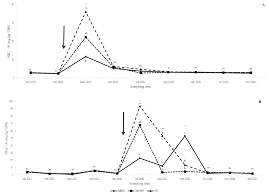 Effect of fertilization treatments on soil ammonium-N (NH4+-N) concentration from December 2019 to December 2020 (A) and from January 2021 to December 2021 (B). Arrows: amendment applications (20 April 2020 and 17 June 2021). MIN: mineral; MOW: municipal organic waste compost; SS: sewage sludge compost. ns, *, **: effect not significant or significant at p ≤ 0.05 and p ≤ 0.01, respectively. Means followed by the same letter are not statistically different (p ≤ 0.05).