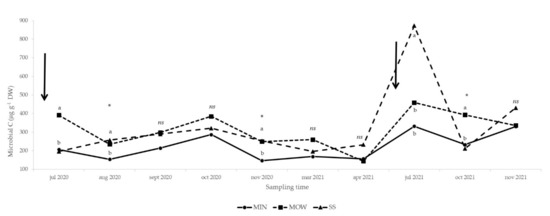 Effect of fertilization treatments on soil microbial biomass C concentration from July 2020 to November 2021. Arrows: amendment applications (20 April 2020 and 17 June 2021). MIN: mineral; MOW: municipal organic waste compost; SS: sewage sludge compost. ns, *: effect not significant or significant at p ≤ 0.05, respectively. Means followed by the same letter are not statistically different (p ≤ 0.05).