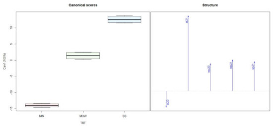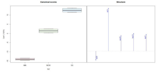 Data were also analyzed, using the R statistical software (candisc package), according to the canonical discriminant analysis (CDA). CDA is a dimension-reduction technique related to principal component analysis and canonical correlation that determines the best way to separate or discriminate two or more groups of treatments, using quantitative measurements of different variables for each treatment [34].