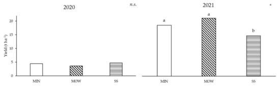 Effect of fertilization treatment on yield in 2020 and 2021. MIN: mineral; MOW: municipal organic waste compost; SS: sewage sludge compost. ns, *: effect not significant or significant at p ≤ 0.05, respectively. Means followed by the same letter are not statistically different (p ≤ 0.05).