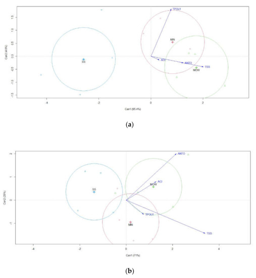 Discriminant canonical analysis of berry composition in 2020 (a) and 2021 (b). MIN: mineral; MOW: municipal organic waste compost; SS: sewage sludge compost; TSS: total soluble solid; ACI: acidity; TPOLY: total polyphenols; ANTO: anthocyanins.