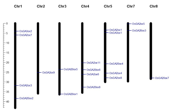 All sequences of 21 GAox genes were downloaded from Phytozome (The Plant Comparative Genomics portal of the Department of Energy’s Joint Genome Institute) [18], which was described in a previous report [17]. Finally, SMART (available online: http://smart.emblheidelberg.de/ (accessed on 15 October 2020)) were employed to further confirm the existence of both 2OG-FeII_Oxy (PF03171) and DIOX_N (PF14226) domains in all identified GAox gene proteins. All GAox genes’ loci and their information, including chromosome location, were searched in the RGAP and DAP-DB (the Rice Annotation Project Database). The map of genes distributed across chromosomes was created with Mapchart software.