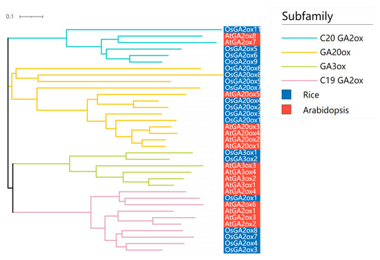In our evolutionary analysis, GAox proteins family in Arabidopsis and rice can be divided into four subfamilies based on their protein sequences. Phylogenetic analysis revealed distinct differences between the two species, such as the number of each subfamily (Figure 2). In some studies, there was another subfamily in some species, GA7ox [33,34,35]. GA7ox, which oxidizes GA12-aldehyde to GA12 and possesses mono-oxygenase 7-oxidase activity, was reported in pumpkin and cucumber but has not been found in other species. So far, although three GA2ox, GA3ox, and GA20ox subfamilies have been found in most plant species, the identification of the GAox gene in other plant species still needs to be performed for finding GA7ox or the other subfamily so that we can have a more comprehensive understanding of the GAox genes’ evolutionary relationship.
