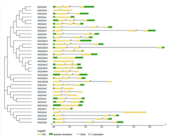 Exon-intron structure of AtGAoxes and OsGAoxes. Exons and introns are shown by filled yellow boxes and thin black lines, respectively. UTRs are displayed by filled green boxes. Intron phases 0, 1, and 2 are indicated by numbers 0, 1, and 2.