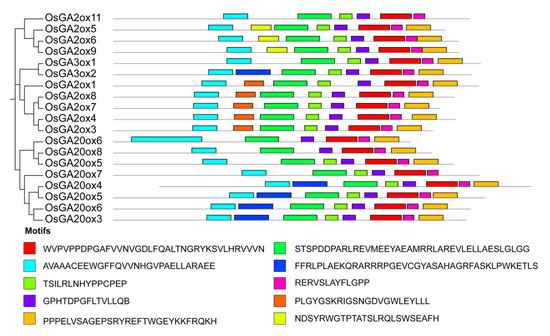 To support the phylogenetic analysis, we performed gene structure analysis of GAox family members from Arabidopsis and rice. As shown in Figure 3, the the number of exons was conserved, ranging from 1 to 3 exons in AtGAox and OsGAox genes. We also investigated intron phases with respect to codons. Most of the first intron was a phase 2 intron which meant that splicing occurred after the second nucleotide and the second intron is generally a phase 0 intron, which meant that splicing occurred after the third nucleotide. This result revealed that the splicing phase was also well conserved during the evolution of GAox genes in Arabidopsis and rice. Generally, the distribution is unequal in intron phases with a bias in favor of phase 0, which indicated that the ancient introns were dominantly of phase 0, so as to favor intron average length of GA oxidase genes in rice shuffling [29,30,31]. In order to better understand the structure of the GAox gene family, we further analyzed the cis-acting elements contained in the first 2000 bp of the 19 OsGAox genes (Figure S1). Most genes have roughly the same cis-acting elements, but different cis-acting elements are distributed in different positions of each gene, which may provide help for studying how to regulate GAox gene expression. To further investigate the relationship among GAox proteins with the same subfamily in rice, 10 different conserved motifs were identified and examined by using the MEME motif search tool in rice (Figure S2 and Figure 4). Motifs 1, 2, 3, 4, 5, 6, and 8 were shared by most of the GAox proteins. Interestingly, there were some specific absent motifs in specific subfamilies. Motif 7 was absent in all the members of C19-GA2ox except for GA2ox8 and motif 10 was shared by all C20-GA2ox and GA3ox. Motif 9 was only shared by proteins of the C19-GA2ox subfamily, which revealed that motif 9 may have a special function in C19-GA2ox subfamily. Differences among motif distributions explained sources of functional divergence in GA oxidases in evolutionary history. However, the function of these motifs in these proteins needed to be investigated further.