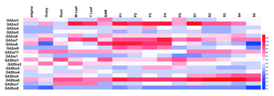 To provide clues for functional studies of GAox genes, we used FPKM values to represent their expression profiles in different organs of rice in this study [32]. Due to the lack of the corresponding probe of OsGA3ox2, we analyzed expression patterns of the other 18 genes (Supplementary Table S2). Our results showed that the OsGAox genes had different expression levels in various organs (Figure 5). It was worthy to note that some OsGAox genes, especially OsGA2ox3, OsGA2ox7, OsGA2ox8, and OsGA20ox6, were highly expressed in panicle and OsGA2ox7 and OsGA20ox6 had a high expression in all organs; however, OsGA20ox8 had a low expression in all organs. Based on the above results, we verified the expression pattern of these five genes from RNA-seq data by qRT-PCR. As shown the Supplementary Figure S3, those genes basically had the same pattern compared to RNA-seq results. Overall, those results represented that each OsGAox gene possessed special expression pattern in various organs, thus promoting the study on potential functions of these genes in different developmental stages of rice.