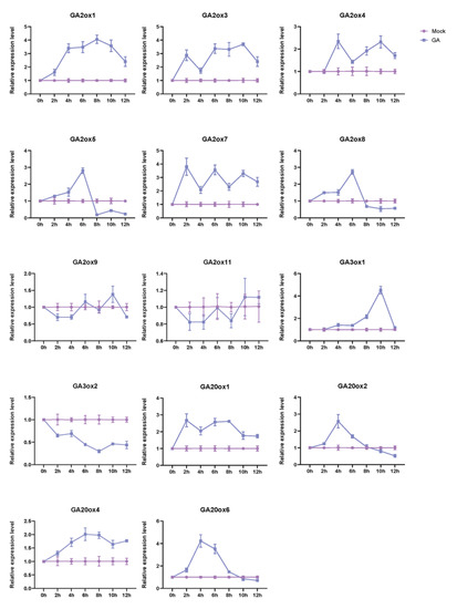 To explore the manner of these 19 OsGAox genes in response to exogenous GA, we treated the 14-day rice seedlings with GA3, then took the leaves of rice seedlings in different time periods and analyzed the expression profiles of 19 OsGAox genes under GA3 treatment by qRT-PCR. As expected, most of them exhibited different expression alteration under GA3 treatment (Figure 6). Results showed that the expression levels of OsGA2ox1, OsGA2ox3, OsGA2ox4, OsGA2ox7, OsGA20ox1, and OsGA20ox4 exhibited an upward trend after GA3 treatment, while the expression levels of OsGA2ox5, OsGA2ox8, OsGA3ox1, OsGA20ox2, and OsGA20ox6 increased first and then decreased. Furthermore, while the expression level of OsGA3ox2 was suppressed, the expression of OsGA2ox9 and OsGA2ox11 had no significant change. For the remaining GAox gene family members, because their Ct value is greater than 35, the test results cannot quantitatively analyze the gene expression, so they are not released. Overall, those results indicated that not all OsGAox genes were involved in the gibberellin homeostasis; some OsGAox genes are the main regulatory genes, but some genes which were not involved in the gibberellin homeostasis may play a role in other aspects of rice developmental progress.
