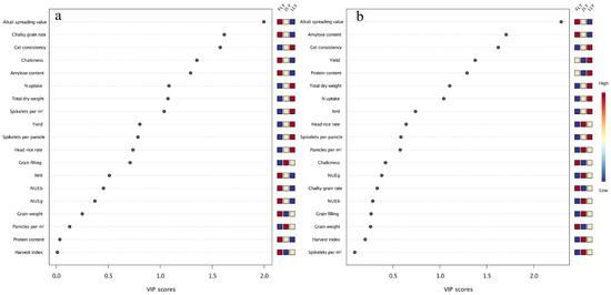 Differences between hybrid varieties derived from 4155S (JLY), hybrid varieties derived from longke638S (LLY) and the control variety Fengliangyou4 (FLY) in parameters related with grain yield, grain quality, and nitrogen use efficiency in 2019 (a) and 2020 (b). Variable Importance in Projection (VIP) is a weighted sum of squares of the Partial Least Squares (PLS)loadings taking into account the amount of explained Y-variation in each dimension shown in Figure S2.