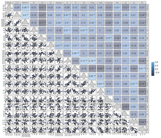 Correlations between parameters related with grain yield, grain quality, and nitrogen use efficiency. * and ** represent significance at p < 0.05 and p < 0.01, respectively. GF: grain filling percentage; GW: grain weight; GY: grain yield; HI: harvest index; TN: Total N uptake; NUEg: nitrogen use efficiency for grain production; NUEb: nitrogen use efficiency for biomass production; ASV: alkali spreading value; GC: gel consistency; AC: amylose content; PC: protein content.