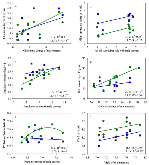 The test hybrid varieties had significantly lower AC than the control inbred variety HHZ except for R3189. R1199, R1988, R8612, R149, and HZ had lower ASV than the other varieties (Table 4). Correlations between male parents and hybrids in yield and quality related parameters were different depending on the female parent (Figure 3). Quality-related parameters for LLY hybrid varieties were more related with that of the male parents (Figure 3a–e). However, the male parents had larger effects on yield variation in JLY hybrid varieties (R2 = 0.40; Figure 3f).